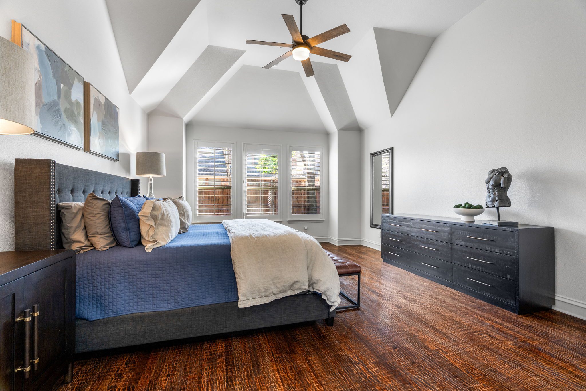 Recent renovations showcase trendy paint, designer fixtures, new flooring, and a clean, contemporary aesthetic throughout. The downstairs primary suite serves as a private retreat, featuring vaulted ceilings that add volume and natural light, along with an ensuite bath.